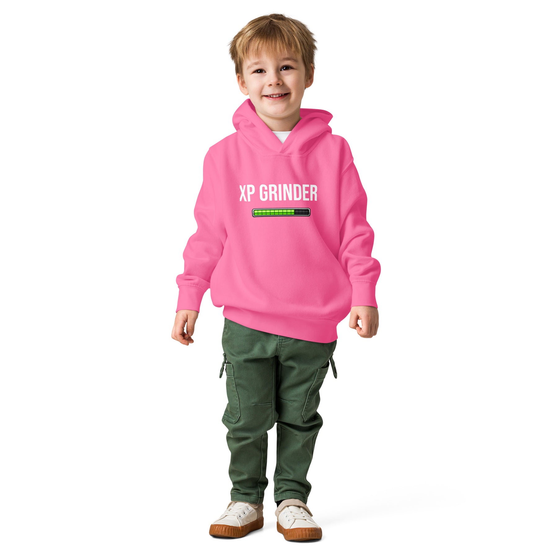 XP Grinder Toddler fleece pullover hoodie in pink with progress bar graphic.