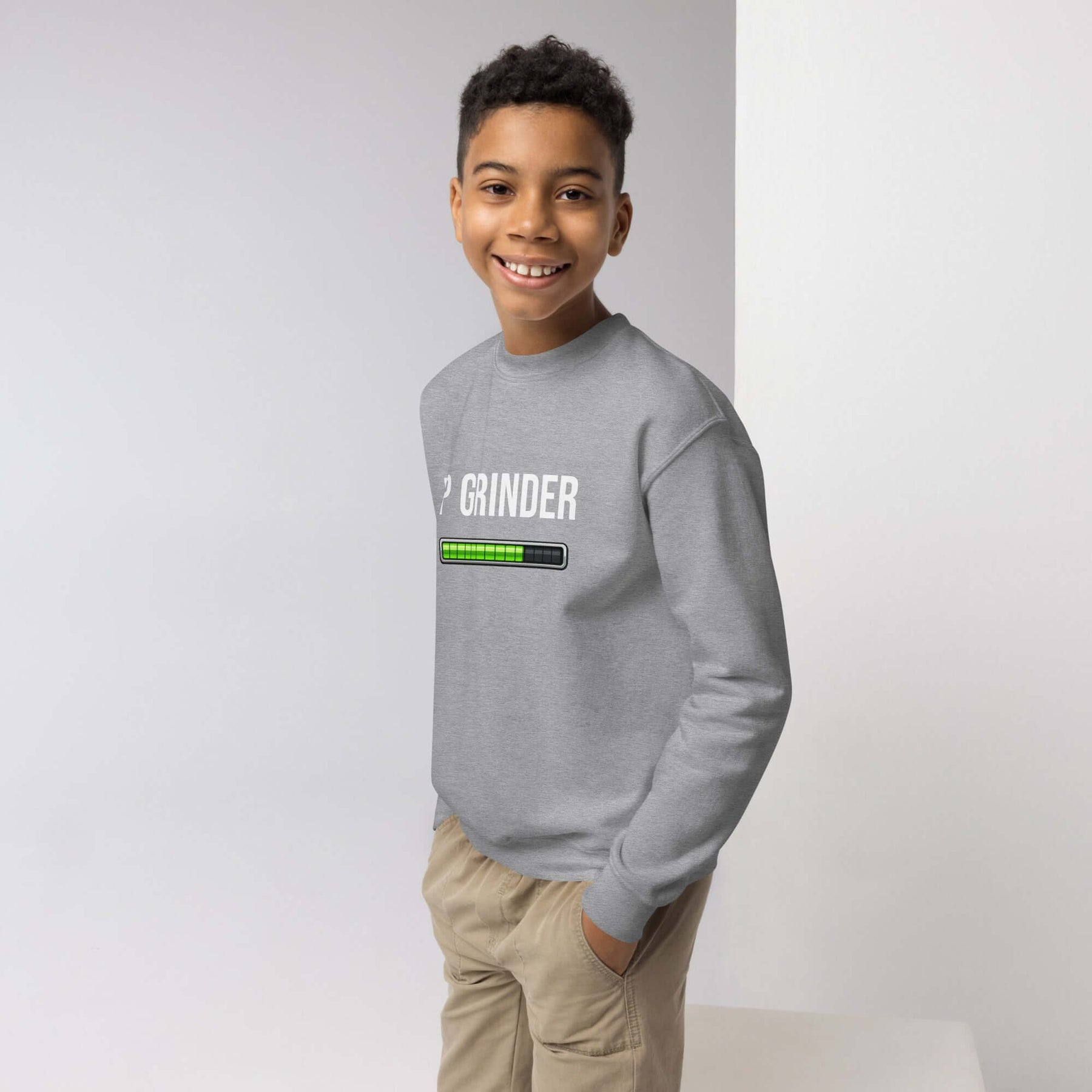 XP Grinder Youth crewneck sweatshirt worn by smiling boy, showcasing cozy design and fun graphic.