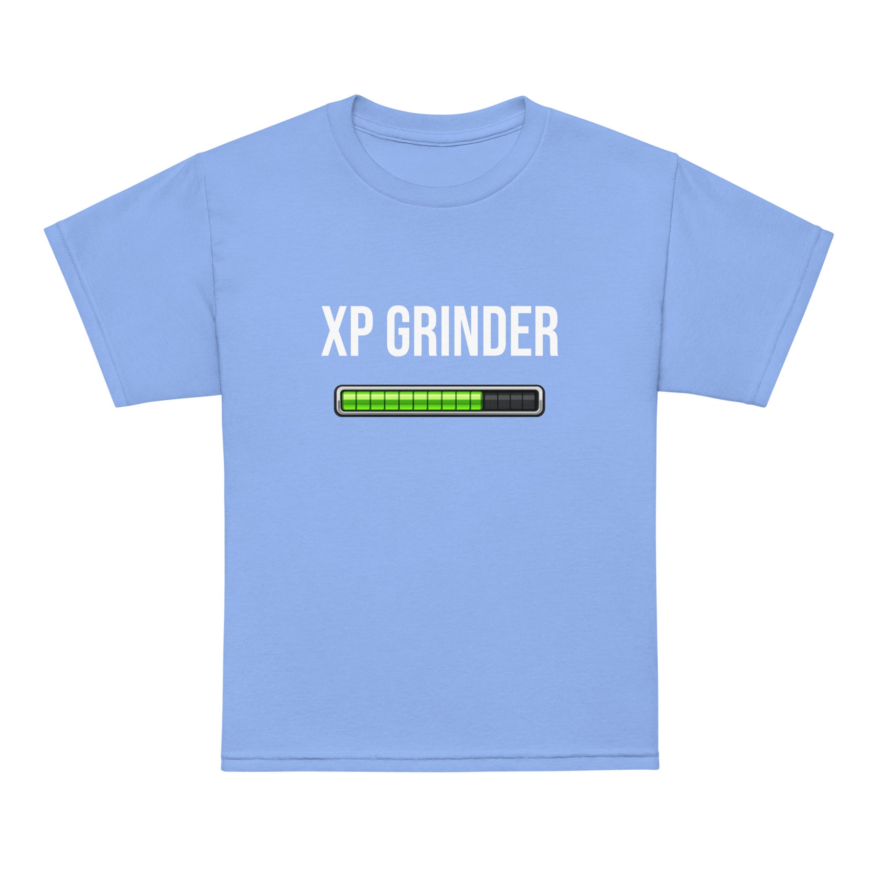 XP Grinder Youth t-shirt in blue with a progress bar design, perfect for active kids.
