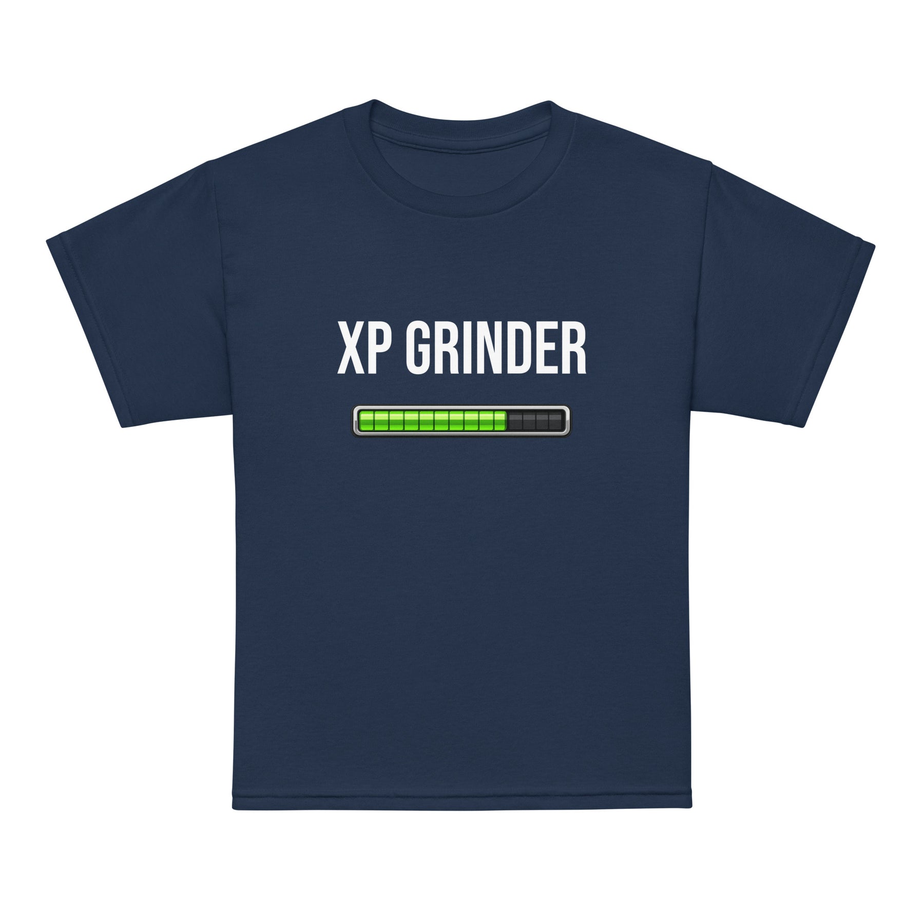 XP Grinder Youth t-shirt featuring a gaming-themed progress bar design on a navy blue background.
