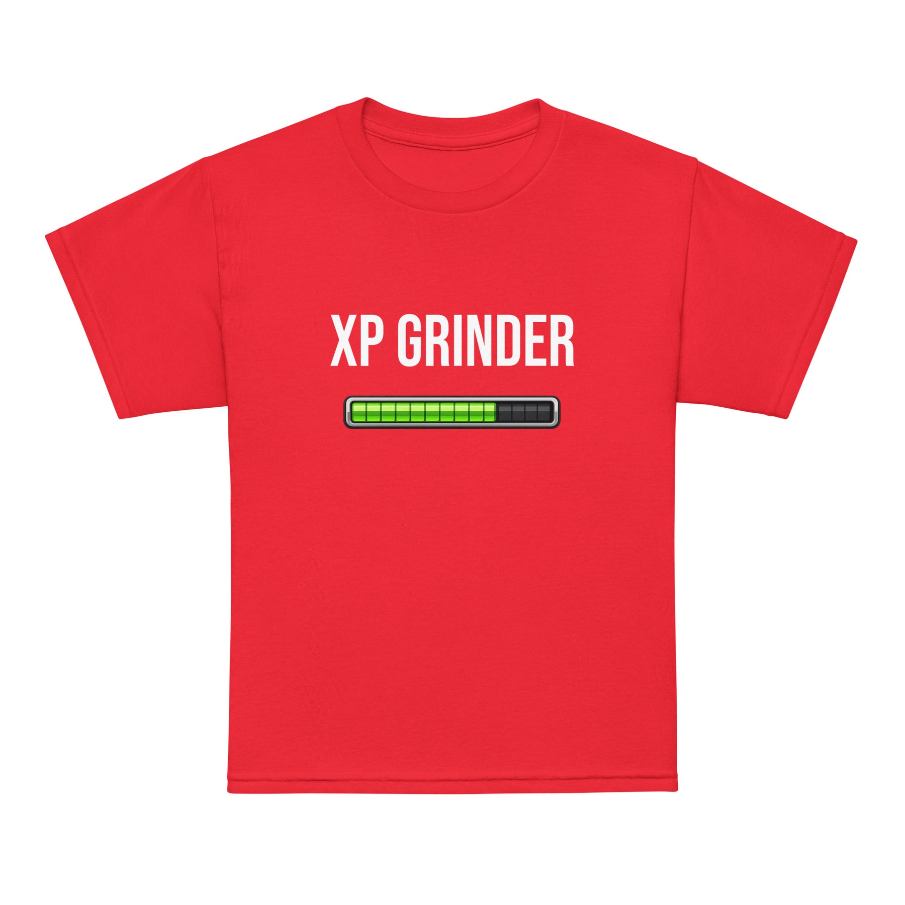 XP Grinder Youth t-shirt in red with progress bar graphic for kids' active wear.